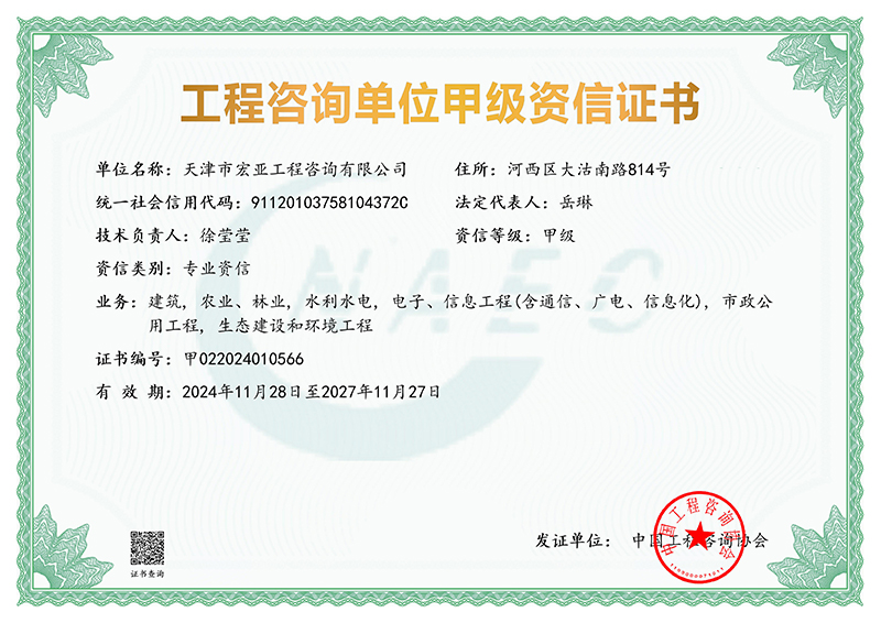 根據(jù)中國工程咨詢協(xié)會2024年第17號公告,天津咨詢所屬宏亞咨詢公司成功獲得建筑,農(nóng)業(yè)、林業(yè),水利水電,電子、信息工程(含通信、廣電、信息化),市政公用工程,生態(tài)建設(shè)和環(huán)境工程等6個專業(yè)甲級資信,并成功升級為甲級綜合資信。