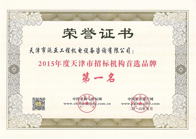 2015年度天津市招標機構(gòu)首選品牌第一名